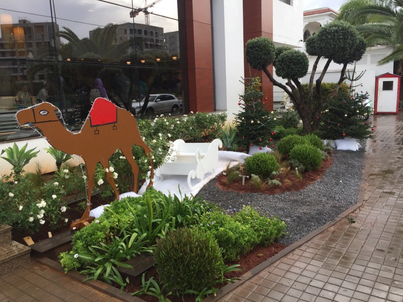 It’s beginning to look a lot like Christmas…in Morocco! With red and green displayed prominently 365 days a year, we have reminded ourselves regularly since arriving last summer that those are national colors, not a perpetual national state of Christmas. Yet, as in the U.S. and elsewhere that Yuletide commercialism makes a cultural mark, we have found the Casablanca march toward Christmas intriguing.