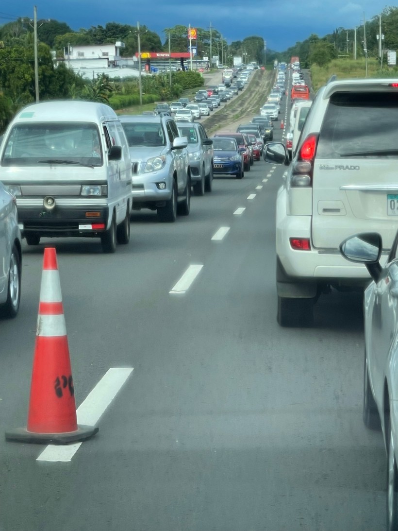 Stretching from the Coronado area (popular with American expats for retirement living and with Panamanians for beach residences) onward to La Chorrera, we wondered if it would continue all the way across the Centennial Bridge and, if so, how many more hours we had left before arriving home.