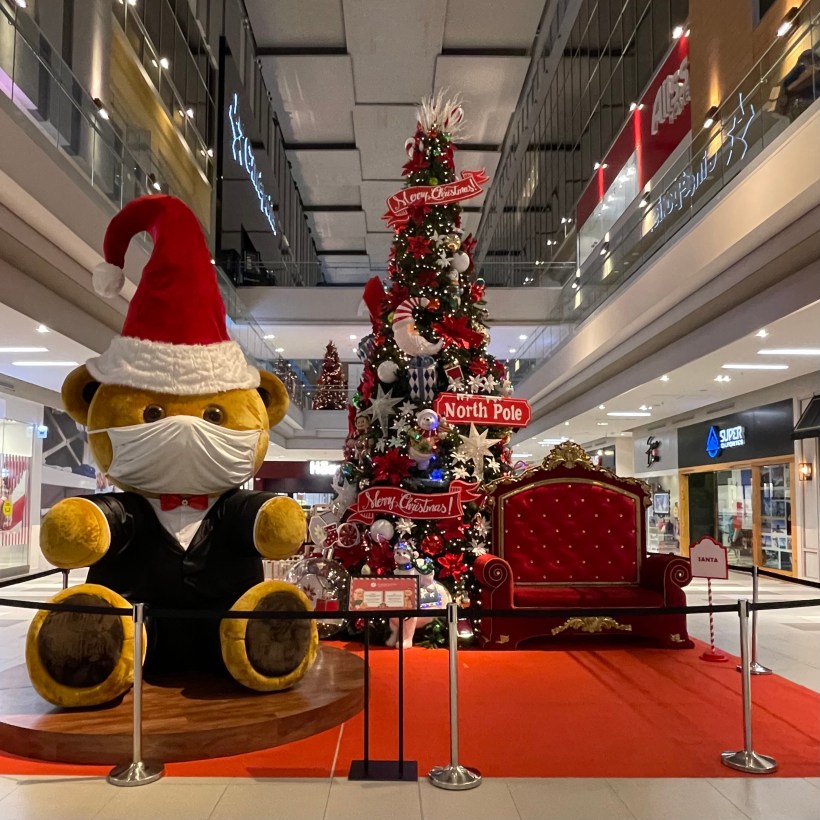 But in Panamá the entire month of November takes on a festive feel as soon as Halloween’s costumes come off and kids come down from their sugar highs.  (To be clear, Halloween is not a big thing in Panamá either, but the commercial and American expat forces seek to build that up as well.)  Panamanian flags and red-white-and-blue bunting go up in schools and shopping malls and neighborhoods and apartment building lobbies to mark the first three holidays on November 3-4-5.  But candy canes, nutcrackers, elves, reindeer, and Santas also appear in abundant grocery store displays, and once the earlier patriotic holidays finish, Christmas decor pours out of stores and neighborhoods like the floods that follow our daily thunderstorm downpours (that soon should wane into the dry season Panamians call “summer”).  Roundabouts in roadways sport strings of Christmas light displays made to look like Christmas trees several stories tall.  Courtyards of commercial buildings and shopping malls put up and decorate trees 20, 30, 40 feet high or more.  Christmas music – sometimes in Spanish, sometimes in English – pipes through speakers.  In the Town Center mall, just three blocks from our new home, a huge teddy bear (appropriately masked for Panama’s COVID-19 protocols) wearing a Santa hat at least 15 feet high sits next to a big Christmas tree at least 10 feet taller and a large, plush, red bench with a sign that advertises it as Santa’s seat.  (We do not know if that is for display only, or if Santa appears now and then to have pictures taken with kids while sitting on his cushy bench.)  In sum, this place goes Christmas crazy throughout the month of November and continues all through la navidad (Christmas).  Thanksgiving as the kickoff to Christmas?  Not a chance. Not here.